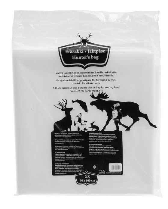 Reilun kokoinen ja kestävä muovipussi elintarvikkeiden käsittelyyn, mainio tuote esim. riistalle. Muovipussin vahvuus on 90 mikronia, joten se kestää painavemmankin saaliin.
