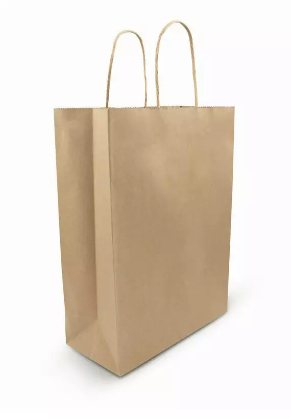 Nyörikahvallinen ruskea paperikassi.