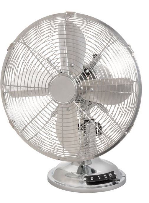 Nelilapainen pöytätuuletin kromatulla viimeistelyllä, metallilavoilla ja täysmetallirakenteella. Erittäin laadukas tuuletin, jossa perinteisiä muovilapaisia tuulettimia korkeampi puhallustehokkuus. Kolme nopeutta ja 70 asteen oskillointitoiminto. 1,6 metrin virtajohto. 35W, 220-240V, 50Hz. Takuu 12 kk.