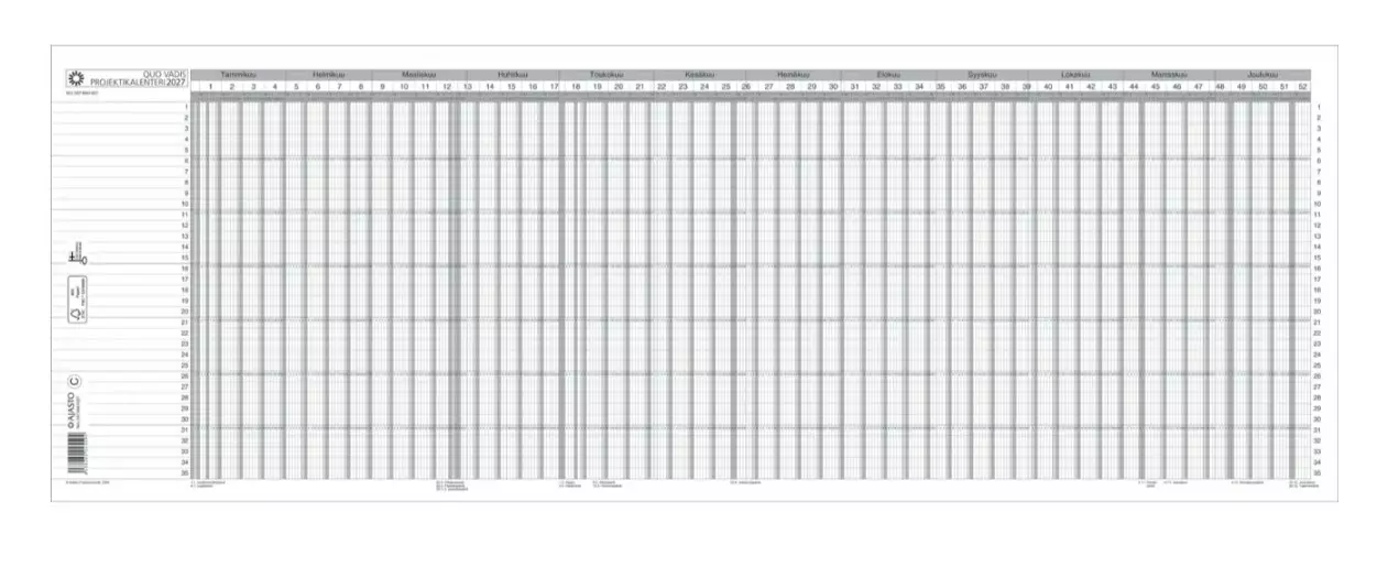 Koko 837 x 297 mm, taitettuna A4; suunnittelukalenteri, jossa koko vuosi kerralla nähtävissä; kuukaudet rinnakkain, myös viikko- ja päiväjaotus; tehtäville ja toimenpiteille rivit allekkain; Avainlippu-tuote; FSC®-sertifioitu tuote.