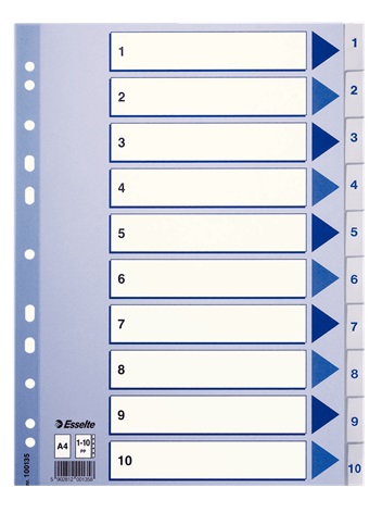 REKISTERI Esselte PP A4, valkoinen Etusivulla vahvistettu rei'itysnauha 10 kielekettä 1-10 painatuksella 11 kansainvälinen rei'itys A4 koko 0,12 mm PP Hakusanat: Kansion välilehdet, kansion... Lue lisää