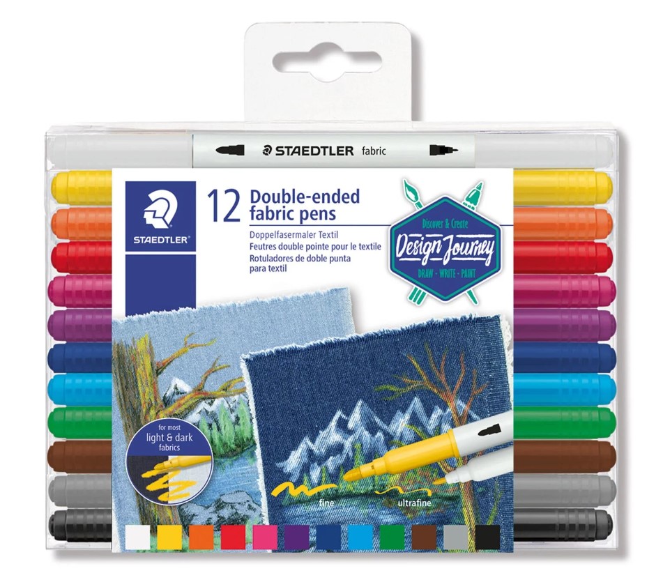 Kaksipäinen tekstiilitussi 12 värin sarjassa.