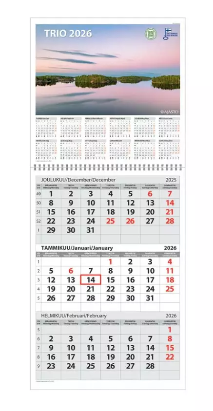 Koko 290 x 415 mm, avattuna 290 x 695 mm; parikierresidottu; kielisyys: suomi, ruotsi, englanti; kannessa värikuva ja koko vuoden taulukkokalenteri; taustapahvissa värillinen Suomen kartta; Avainlippu-tuote; FSC®-sertifioitu tuote; 100 % hiilineutraali tuote.