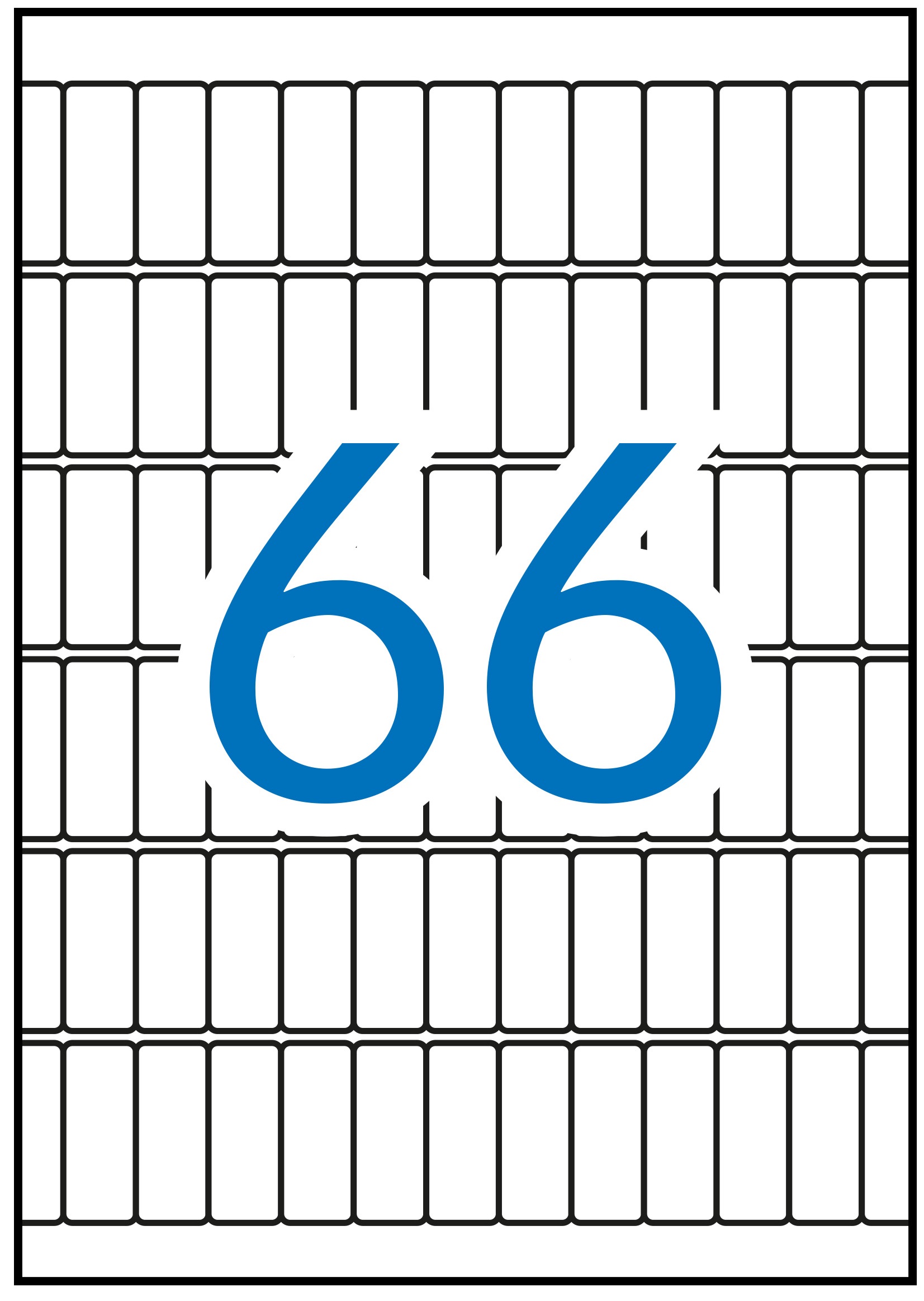 - Valkoinen A5 arkki on jaettu 66 tarraan, joiden mitat ovat 12 x 30 mm.